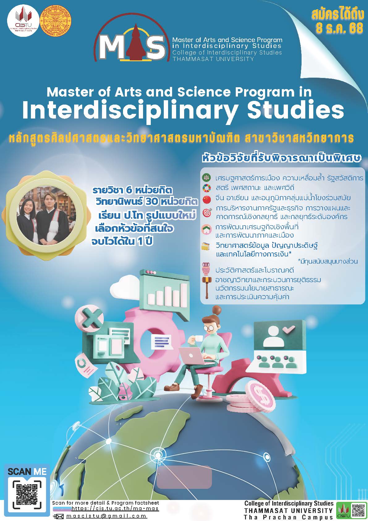 📣หลักสูตรศิลปศาสตรและวิทยาศาสตรมหาบัณฑิต สาขาวิชาสหวิทยาการ (Master of Arts and Science in Interdisciplinary Studies - MAS) วิทยาลัยสหวิทยาการ มหาวิทยาลัยธรรมศาสตร์ เปิดรับสมัครนักศึกษารุ่นที่ 2 ในภาคการศึกษาที่ 2 ปีการศึกษา 2568 (เปิดเรียนเดือนมกราคม 2569)
